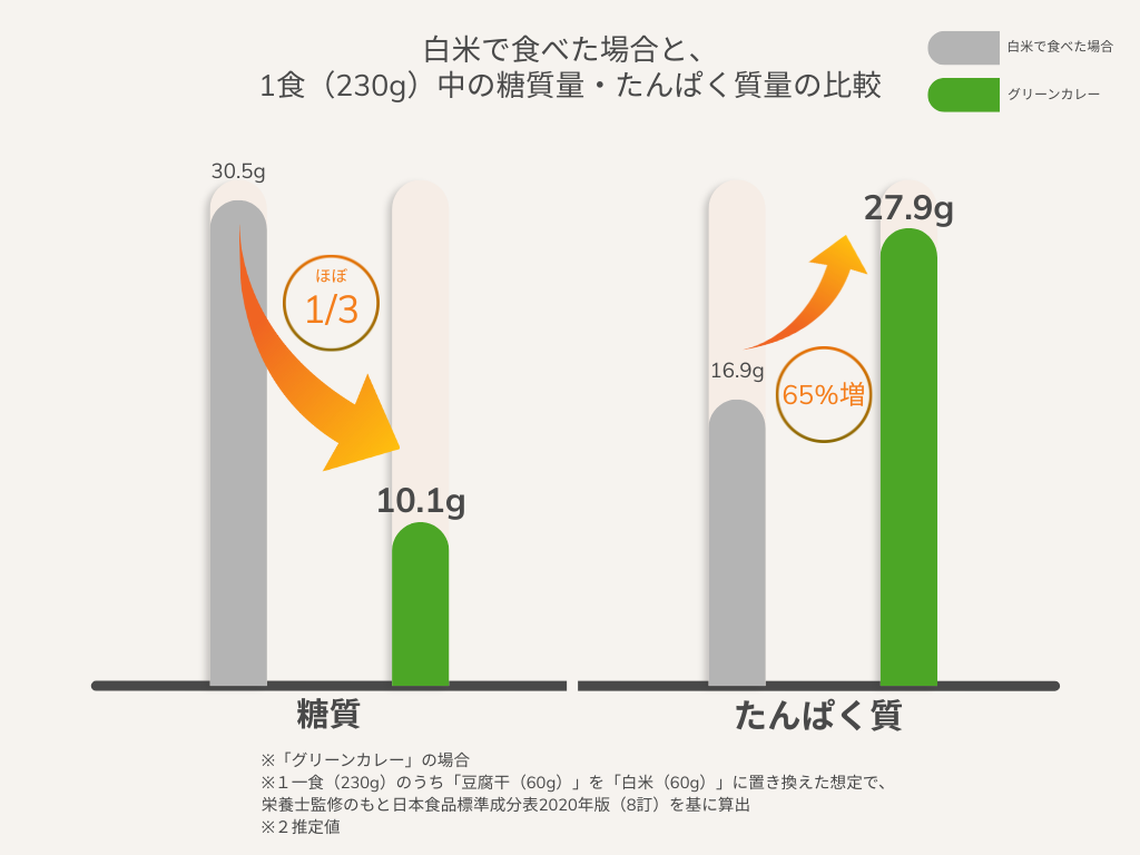 白米で食べた場合と、1食(230g)中の糖質量・たんぱく質量の比較