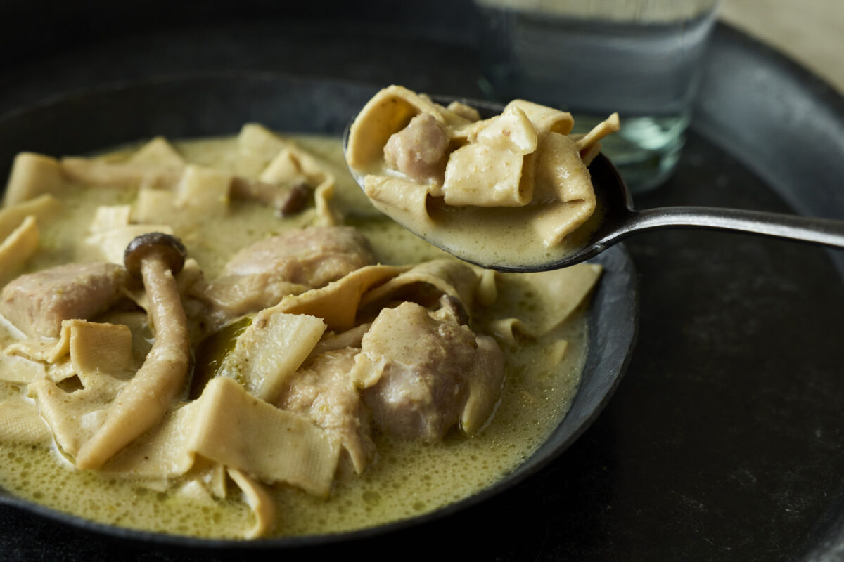 コブミカンの葉やナンプラーが豊かに香る本格グリーンカレーには、ほろほろのチキンとしめじ・たけのこがたっぷり。