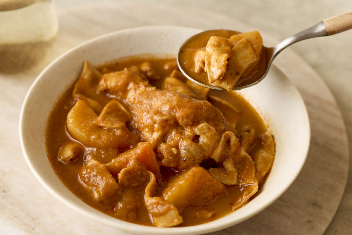 にんじんとじゃがいもの甘みが溶け出した本格スープカレーに、骨ごと煮込んだ手羽元チキンがゴロリ。大きめの具材は、ホロリと崩れる柔らかさ。