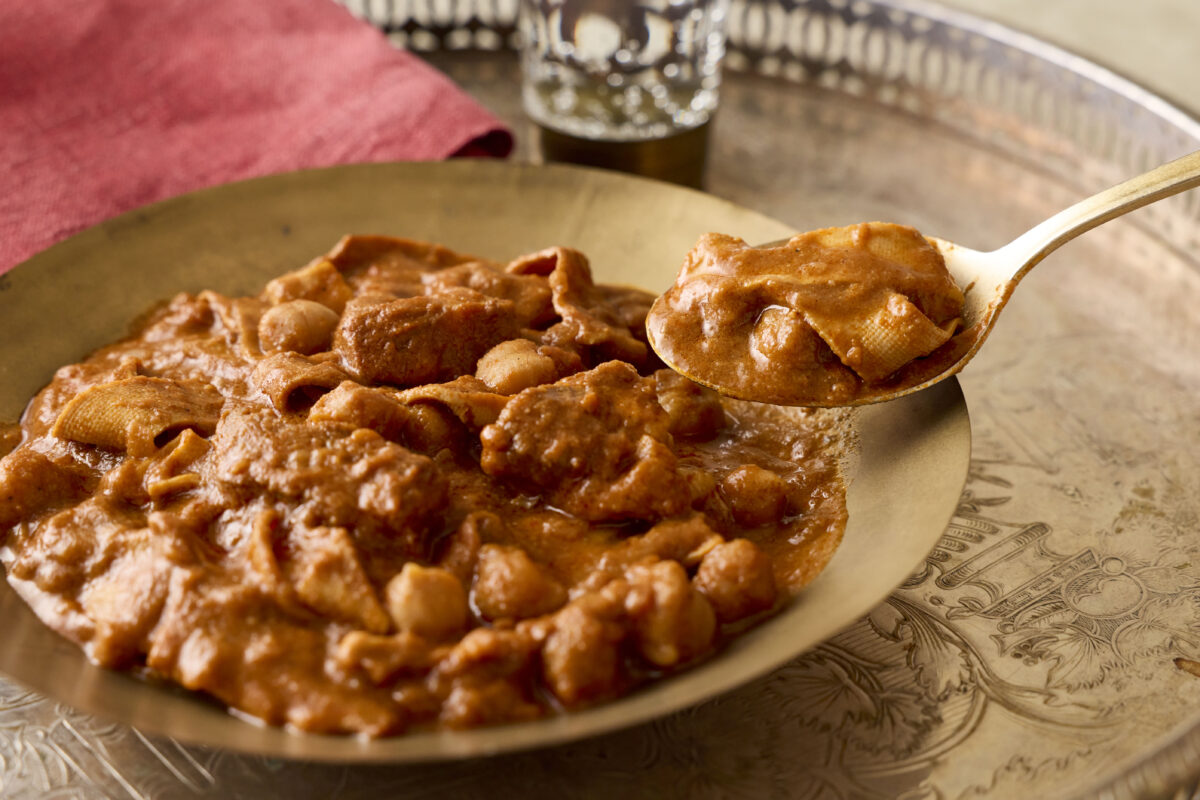 トマトの風味が食欲をそそるインド風の本格マサラカレーに、柔らかく煮込んだ豚肉とひよこ豆がゴロゴロ。