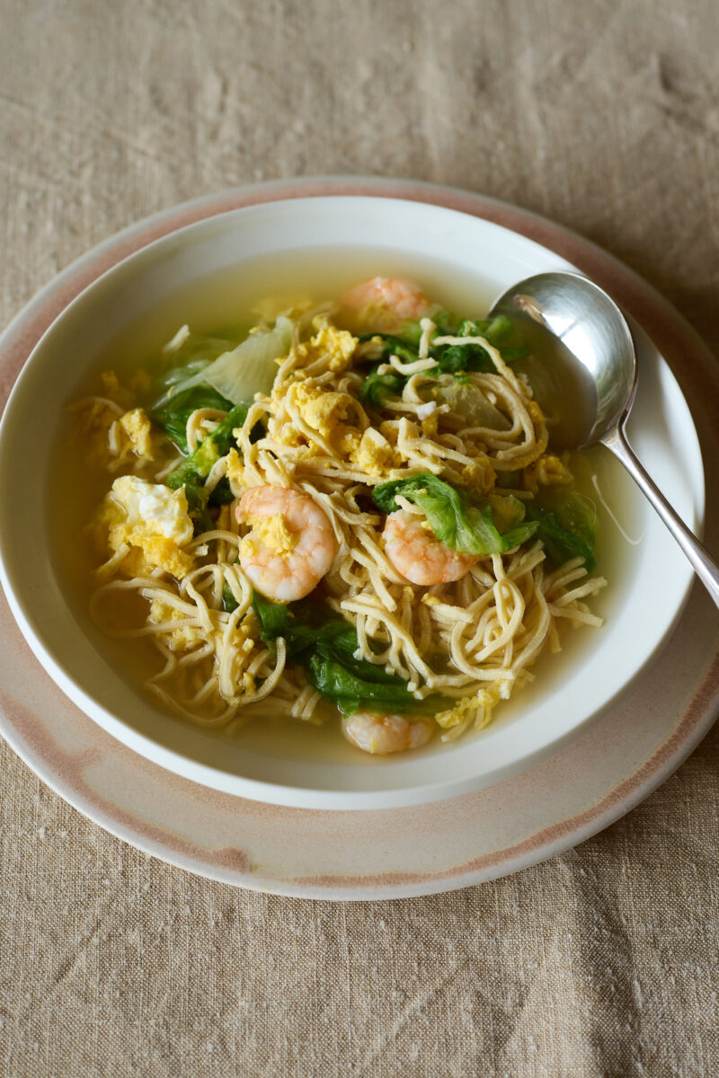 えびはあれば背わたを除き、水で洗って水気をペーパタオルで拭く。レタスはひと口大にちぎり、卵は割りほぐす。