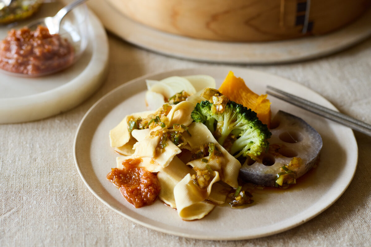 鍋に湯を沸かす。せいろにかぼちゃ、玉ねぎ、れんこんを並べ入れ、蒸気の上がった鍋にの