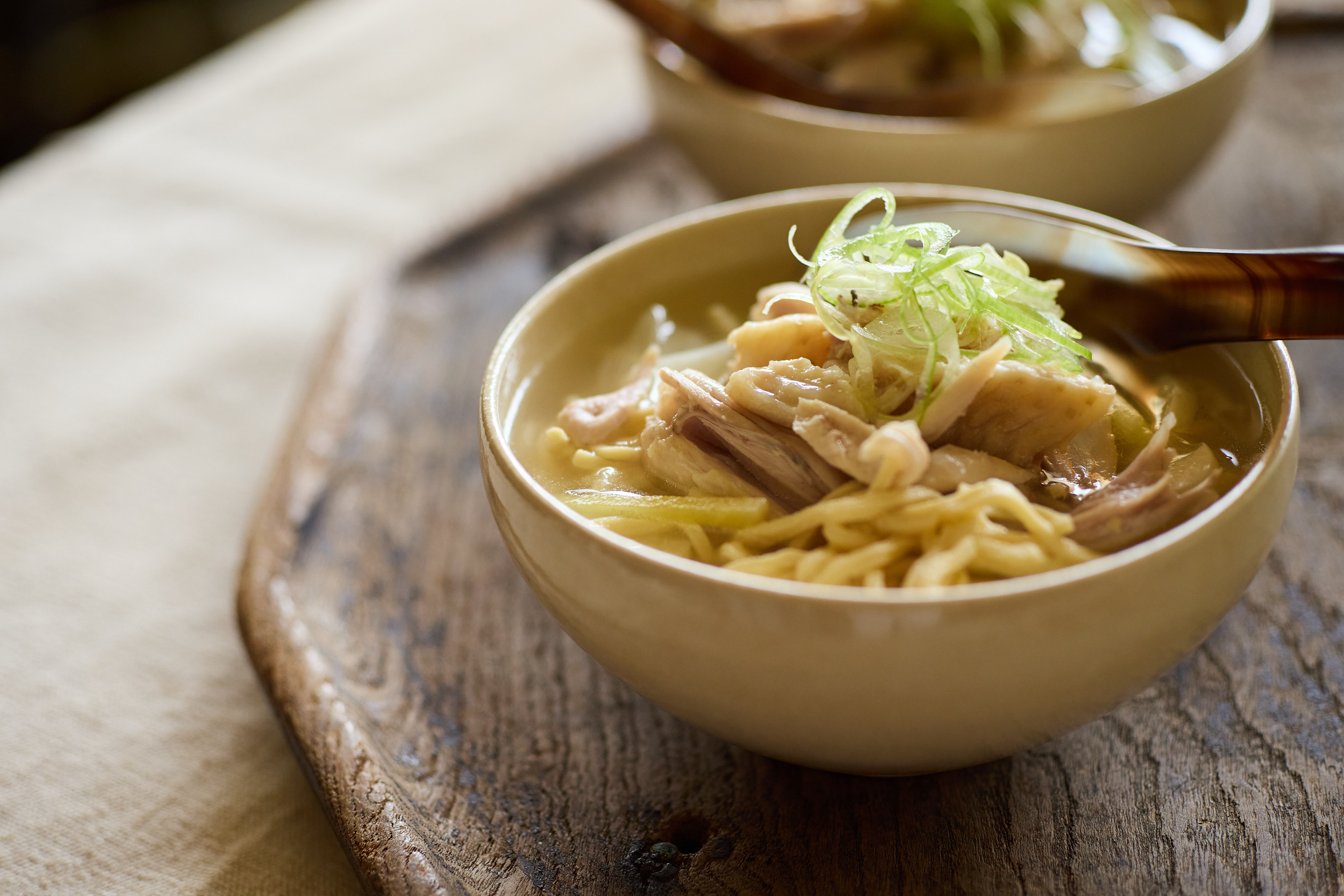 ③の鶏肉を取り出して骨を除き、鍋に戻し入れてさっと混ぜる。