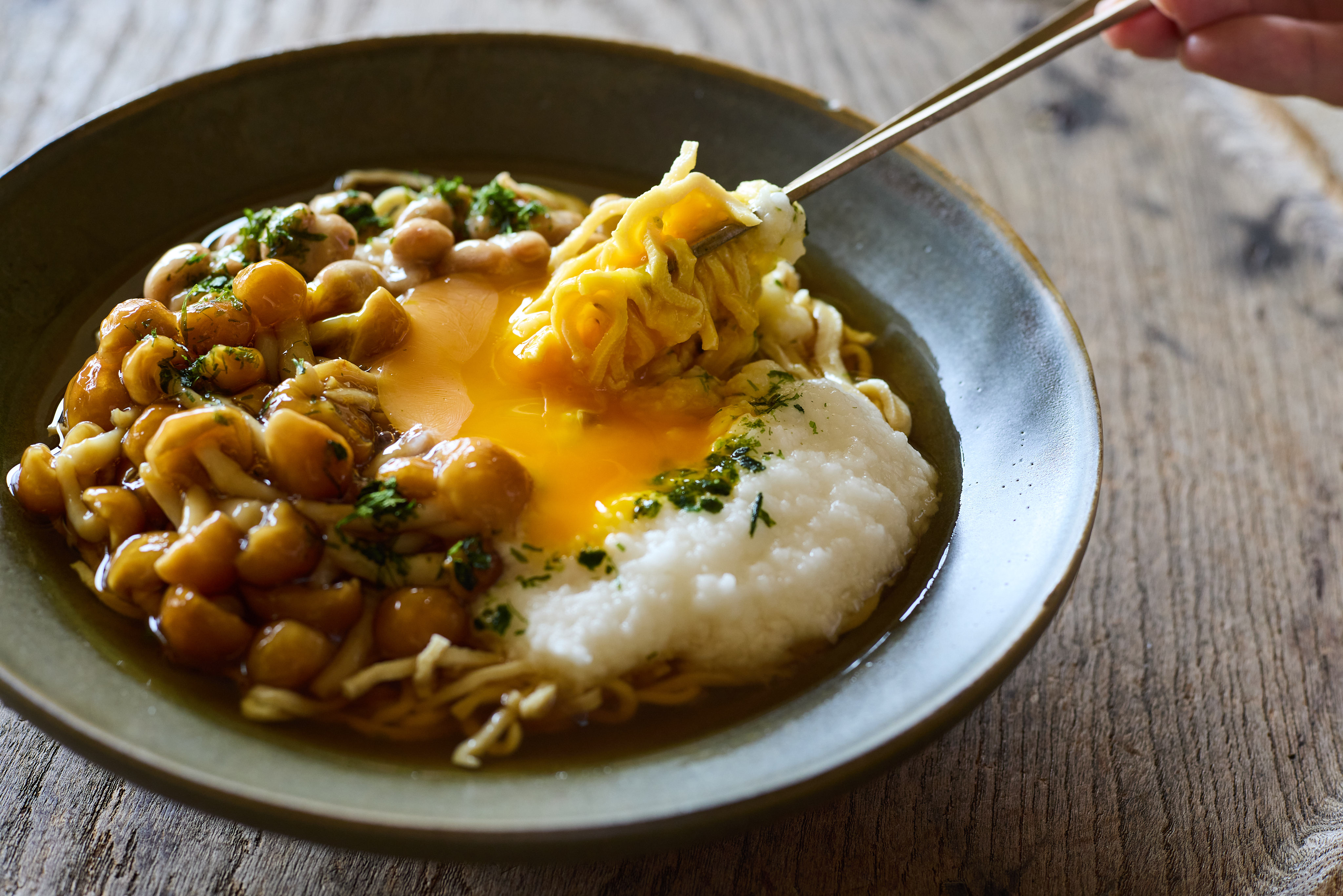 器に豆腐干、納豆、長いも、なめこを盛る。卵黄をのせてAをかけ、青のりを散らす。